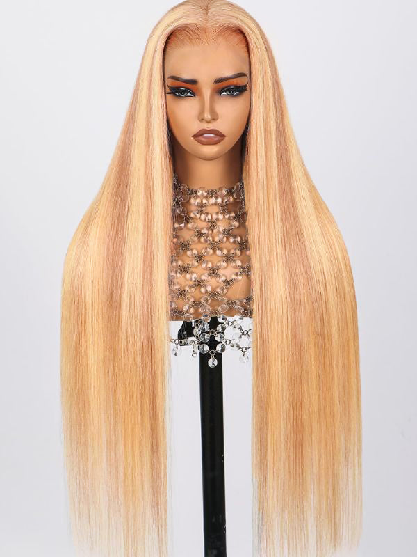 P10/613 Glueless Straight 13x4 Swiss HD Lace Front Wigs Human Hair Blonde and Light Brown Highlight Lace Front Wig Human Hair